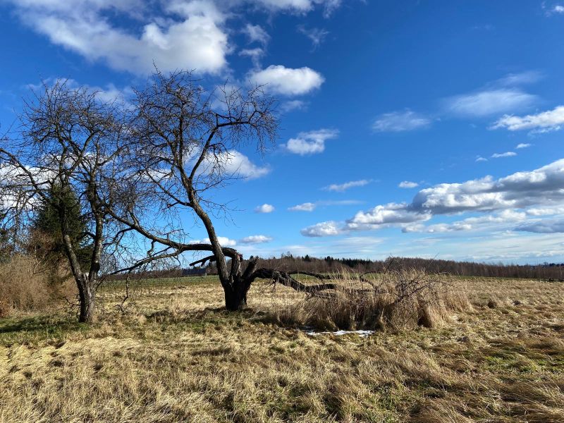 Droga nagle się kończy, zaczyna pole, więc to moment nawrotki. Wracam tą samą trasą do głównej drogi. Tym razem zjazd w dół. Mijam skrzyżowanie z lokalną restauracją i odliczam mniej więcej połowę trasy. Chwila wzdłuż ulicy i znowu skręt w głąb drugiej wsi. Po lewej stronie mijam opuszczony bardzo stary dom, którego bryła jest zupełnie inna niż współcześnie budowane domy. Ma powybijane szyby i zasłaniają go również bardzo stare drzewa. Nie jest ogrodzony, więc kiedyś zeszłam z roweru i przeszłam się wokół niego. Ma potencjał, jest wyjątkowy i szkoda, że tak marnieje.